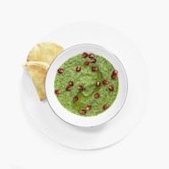 In a blender, combine the chickpeas, tahini, cilantro, spinach, salt, garlic, lemon juice, and olive oil, and blend until smooth.
