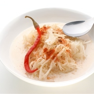 Melt the fat in a skillet. Cut the sausage into small pieces and fry them. Add to the soup.