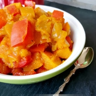 Cut the peeled pumpkin into pieces, mix with the sliced bell pepper and the fried fat.