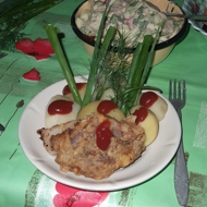 Boil the potatoes in their skins, then peel. Arrange the potatoes on a serving plate, followed by a piece of the cutlet and a piece of fried pork fat.
