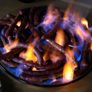 Arrange the hunter's sausages on a thick glass or metal dish so that they completely cover the bottom.