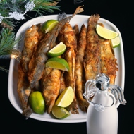 Spread the flour mixture on a large board and coat each fish in it. Heat vegetable oil in a frying pan (the amount depends on the size of the pan, and therefore on the number of fish that can fit in it at once). In any case, you don't need a lot of oil — the fish is not deep-fried, but simply pan-fried.