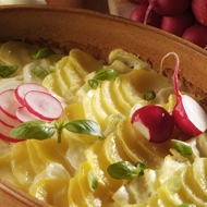 Arrange all the potatoes in a fireproof ceramic dish, layering the slices loosely.
