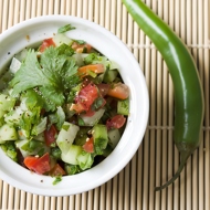 Then add the finely chopped green onions, cilantro, deseeded and finely chopped peppers, vinegar, and garlic oil. Mix well. Season with salt and pepper.