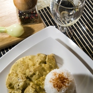Sauté the blanched onion, add the sautéed flour, spices, a small amount of broth, season with salt, and mix. Pour this sauce over the chicken, add the peeled and sliced sweet apples, and simmer until cooked through.