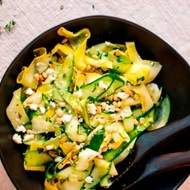 Grate the carrot using a coarse grater, finely chop the onion, slice the radish into thin rounds, and cut the zucchini into thin strips. Combine the vegetables and add fresh mint leaves. Dress with sauce and mix well.
