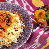 Preheat the pot. Grease the walls with a tablespoon of melted butter. Place a flatbread at the bottom, brush it with another tablespoon of butter, and fill it with rice up to the top of the flatbread. On top, layer nuts, dried fruits, and citrus zest, and then add the remaining rice. Smooth out the surface of the rice, pour 5 more tablespoons of melted butter into the center, and create a ring of saffron water around the edge so the rice is unevenly colored, resulting in a velvety hue. Cover the pot with a lid, place it on the stove, and once the lid is heated, reduce the heat to the minimum and let it cook for an hour.