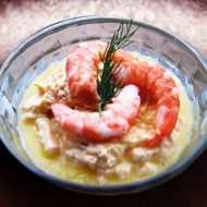 When serving, garnish with whole shrimp and a sprig of herbs.