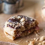 Melt the chocolate in a water bath. Spread the cooled cookies with jam. Dip in chocolate and sprinkle with nuts.
