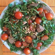 In a salad bowl, place the arugula, halved cherry tomatoes, liver, and garnish with pine nuts.