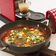 Add salt, black or white ground pepper, and parsley. Carefully crack the eggs into the sauce so that they do not spread out, but instead sit in their own little wells. Add pieces of feta or another soft, salty cheese. You can lower the heat under the skillet to the minimum. Then, you can either place the skillet in the oven for three minutes or cover it with a lid. The eggs should maintain a sufficiently runny yolk.
