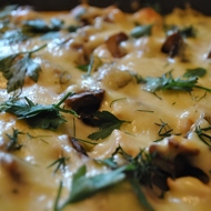 For the sauce, mix the cream or milk with the seasonings, place it over heat, and let it warm up.