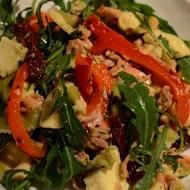 Combine the aforementioned ingredients and tuna with the pasta, dress it, and mix well. Before serving, add the arugula (also toss gently to keep the arugula crisp).