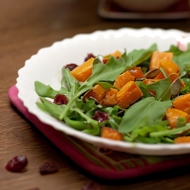 Combine the arugula, dried cranberries, and seeds in a bowl, then drizzle with the dressing. After that, add the pumpkin, mix again, and it's ready to serve on plates!