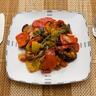 Then add the minced garlic, cherry tomatoes, and chopped herbs. Stir and cook until the tomatoes are soft. Season with salt and pepper and serve warm or at room temperature.