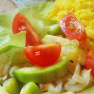 Sort through the fresh herbs and lettuce leaves, wash them, and dry them. Finely chop the herbs and mix them with the warm vegetables. Arrange the lettuce leaves on plates and mound the salad on top. Serve warm or cold.