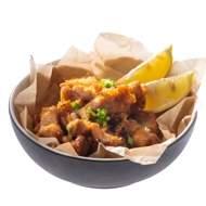 Arrange the karaage chicken on a plate, garnish with rings of green onion, and serve with a wedge of lemon.