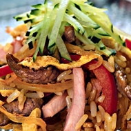 Wash the cucumber and cut it into strips. Cut the ham in the same way. Add the sautéed onions, bell peppers, and beef to the rice. Incorporate the ham and strips of omelet, and mix well. Pour in the remaining soy sauce and season with spicy pepper. Add salt if necessary. Before serving, sprinkle with the chopped cucumber.