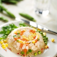 Add the port wine to the cooled broth. Then pour a little broth into each of the four oval cups, creating a 1 cm layer. Place the molds in the refrigerator for 15 minutes. Peel the eggs. Cut the beans into thin strips and arrange them beautifully on the set broth in the cups. Then place a slice of ham. Next, add an egg, surrounded by salad with mayonnaise. Finally, pour the remaining broth over the entire structure and place the cups in the refrigerator to set the jelly.