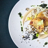 Place the cauliflower puree on a plate. In the center of the plate, add two Jerusalem artichoke patties. Drizzle chimichurri sauce over the top and sprinkle with dried olives. Garnish with slices of cauliflower that have been lightly charred with a torch, and with celery leaves.