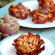When the outer leaves turn golden, wet your palm with cold water and sprinkle the artichokes to make them crispy.