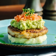 To serve, place the mashed potatoes on a plate, then add the cutlet on top, and finish with a dollop of avocado puree on the cutlet.