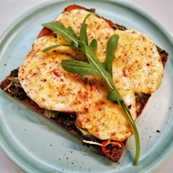 Top with arugula and thin slices of tomato (about 6–8 mm).