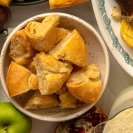 Homemade cookies, the dough for which is usually made with matsoni, resulting in a light, flaky texture with a creamy taste. However, you can substitute buttermilk or just use water. The shape of the baked goods can be anything: Kada is often prepared as a long roll, sliced into rounds, or shaped into spirals, pillows, or crescents. The filling is always the same: flour sautéed with butter and sugar. It may seem simple, but it’s tastier than any cleverly whipped pastry cream.