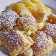 Tear the finished pancakes into pieces, pile them up, drizzle with jam, and sprinkle with powdered sugar.