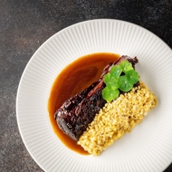 Arrange the ribs and bulgur on a plate, drizzle with demi-glace sauce, and garnish with cilantro.