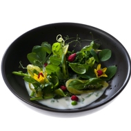 Pour the sauce made from fermented baked milk onto the bottom of a plate. Add kale, peas, and bell pepper, then garnish with basil leaves and assorted garden herbs; even cucumber flowers and nasturtiums will work.