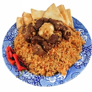 When serving, mound the rice on a plate and place the baked filling on top. Serve separately with matsoni and cinnamon.