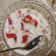 Place the grapefruit and almond flakes into molds and pour the kefir-milk mixture over them.