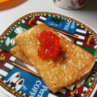 Place the pancake on a plate and spread it with butter. Repeat with each pancake. Serve with red caviar.