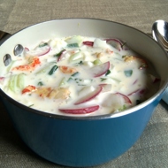 Mix the radishes, pickles, eggs, herbs, onions, and crawfish tails. Dress with the mustard and yolk mixture, and stir.
