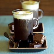 In 2 clear mugs, pour 2 tablespoons of brandy, Kahlua liqueur, and cocoa liqueur each.