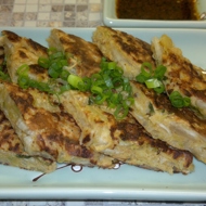 Place the pancakes on a cutting board, cut into diamond shapes, transfer to a plate, drizzle with the sauce, and sprinkle with green onion on top.