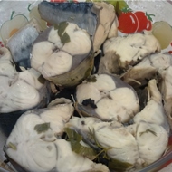 Boil the cleaned and chopped mackerel (any kind, but not smoked or salted) in salted water for 30 minutes, adding bay leaves and peppercorns. Once cooked, remove from the broth to cool.