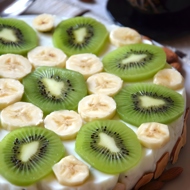 Spread the first layer with our cream and place the kiwi and bananas on top of the cream. Then place the second layer on top and repeat the same process as with the first. Place the third and final layer on top and repeat the same process as with the first and second layers. Leave in the refrigerator for 30 minutes or up to an hour. P.S. I left the pie in the refrigerator overnight. That's also a good option. ENJOY YOUR MEAL.