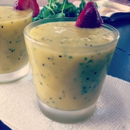 Blend the fruits in a blender until smooth puree. Add the juice and 4 mint leaves. Blend again.