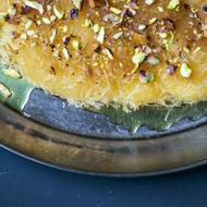 Knafeh is a delicious Middle Eastern dessert made with thin noodle-like pastry soaked in syrup and layered with cheese or cream. It's typically served warm and topped with crushed pistachios or walnuts, offering a delightful combination of textures and flavors. This sweet treat is perfect for sharing with family and friends during gatherings or special occasions.
