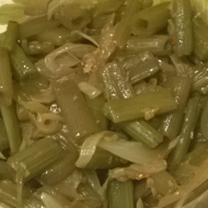 Slice the onion into half rings and lightly sauté in vegetable oil, then add the burdock stems. Sauté lightly or simmer covered for about 5 minutes, then add soy sauce, about 1 tablespoon, but no more, as it is very salty. Simmer for another 5 minutes and add yannem. Remove from heat, let cool. You can add a bit of sugar or ajinomoto (monosodium glutamate).