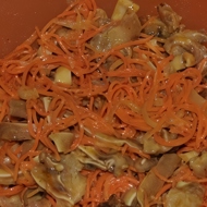 Add the prepared carrot and pork ears to the well-heated oil, quickly mix everything, and fry while stirring constantly for about one minute.