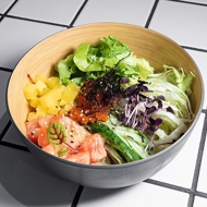 Spoon 1 tablespoon of gochujang sauce over the rice. Arrange segments of lettuce, iceberg lettuce, cucumber, daikon, and salmon on top.