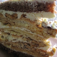 Assemble the cake: - chocolate layer - sour cream frosting - - white layer with meringue up - buttercream - - white layer with meringue down - sour cream frosting - - white layer with meringue up - buttercream - - white layer with meringue down - sour cream frosting - - chocolate layer. The recipe provides enough frosting just for coating the layers, so you can make your favorite frosting to cover the top and sides, or cover it with fondant, as you wish.