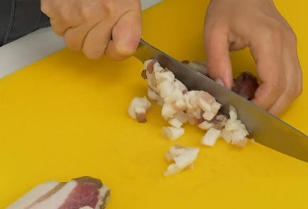 Dice half of the pork fat into small cubes of about 5 mm, finely chop the onion, and sauté the onion with the pork fat in butter until golden brown. Season with pepper.