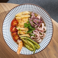 In bowls, place the egg noodles, tamago omelet, cherry tomatoes, kimchi cucumbers, shrimp, and squid.