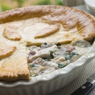 Form the pie from the prepared dough and fillings: set aside one-fourth of the dough for the top, roll out the remaining dough into a round flatbread about 1 - 1.5 cm thick, place it in a greased baking dish or skillet so that the edges are covered with dough, layer the fillings: rice, sliced eggs, sliced chicken, mushrooms. Roll out the top, cover the pie, and make a hole in the center of the top to allow steam to escape during baking.