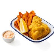 Serve the fried omul in batter with sweet potato fries and shri-mayo sauce, accompanied by a wedge of lemon.