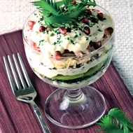 Layer the salad bowl with lamb, apples, cheese, and radishes, spreading mayonnaise between each layer and sprinkling with herbs and pomegranate seeds.